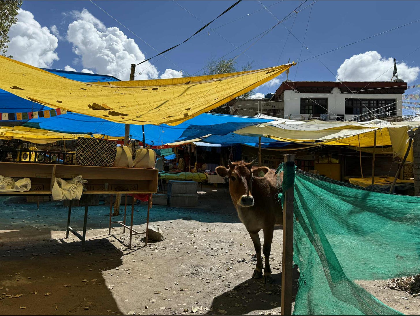 What do the animals eat in this desert of cement and asphalt? Cardboard and plastic, I am told time and again. A single blade of grass is a feast. After a few days in Leh, I begin to recognize certain animals as I wander the streets — the leather-colored dog with the black muzzle, the cow with a white patch on her chest that lies down each noon beside a car at a construction site, the five donkeys that seek out a terrace where they can huddle together for the night. I greet them and sometimes try to touch them with my fingertips. Together we wander, lost in thought, along this path of life — unknowing, moving toward a destination we dream of but cannot conceive.
